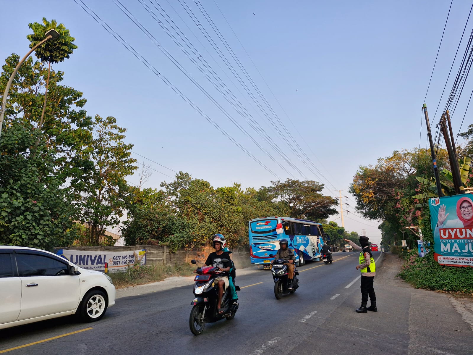 Cilegon,Polres Cilegon Polda Banten Pada Senin/24/11/2025 Pukul 06.30 Wib, Personil Siwas Polres Cilegon, Aipda Emi Prasetyo melaksanakan kegiatan pengaturan arus lalu lintas di Jalur Protokol jalan utama Kota Cilegon tepat nya di jalur depan perumahan arga baja Pura Kota Cilegon.