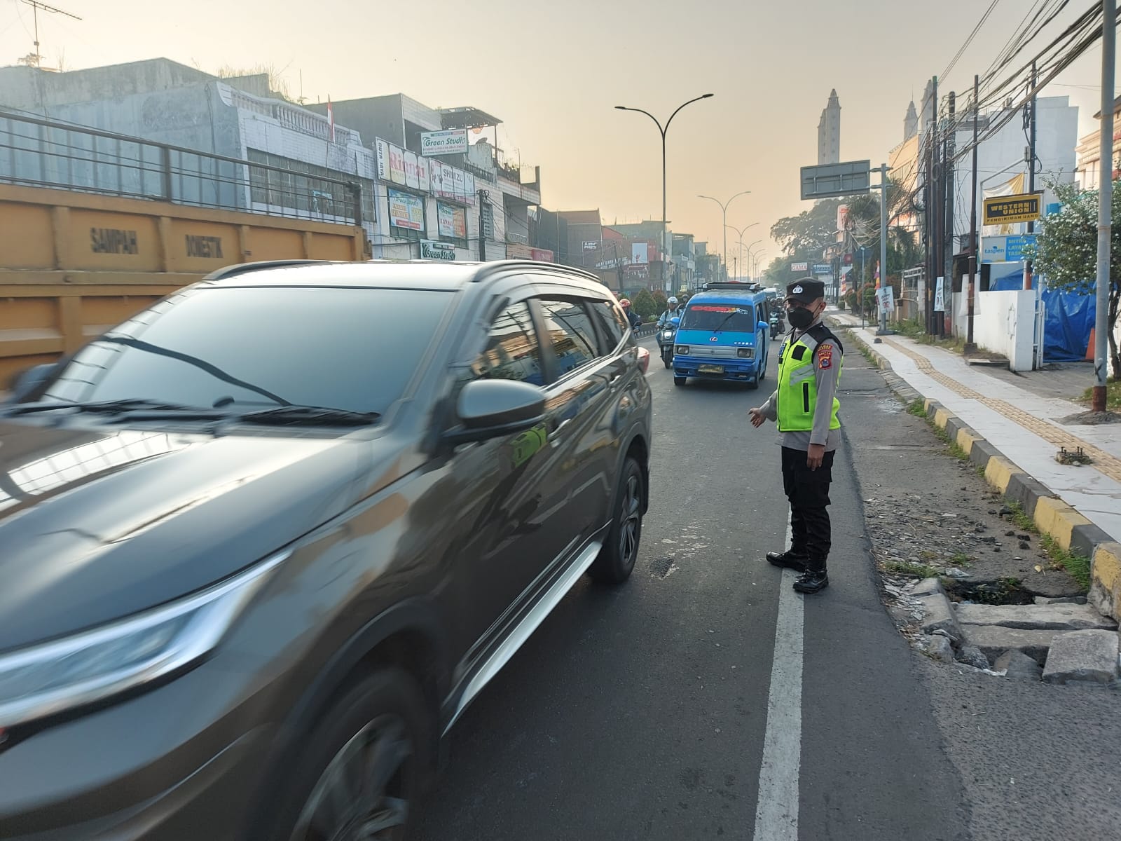 Cilegon,Polres Cilegon Polda Banten Pada Hari Senin/24/11/2025 Pukul 06.30 Wib, Personil Siwas Polres Cilegon, Brigadir Hadi Sudrajat melaksanakan kegiatan pengaturan arus lalu lintas di Jalur Protokol jalan utama Kota Cilegon.