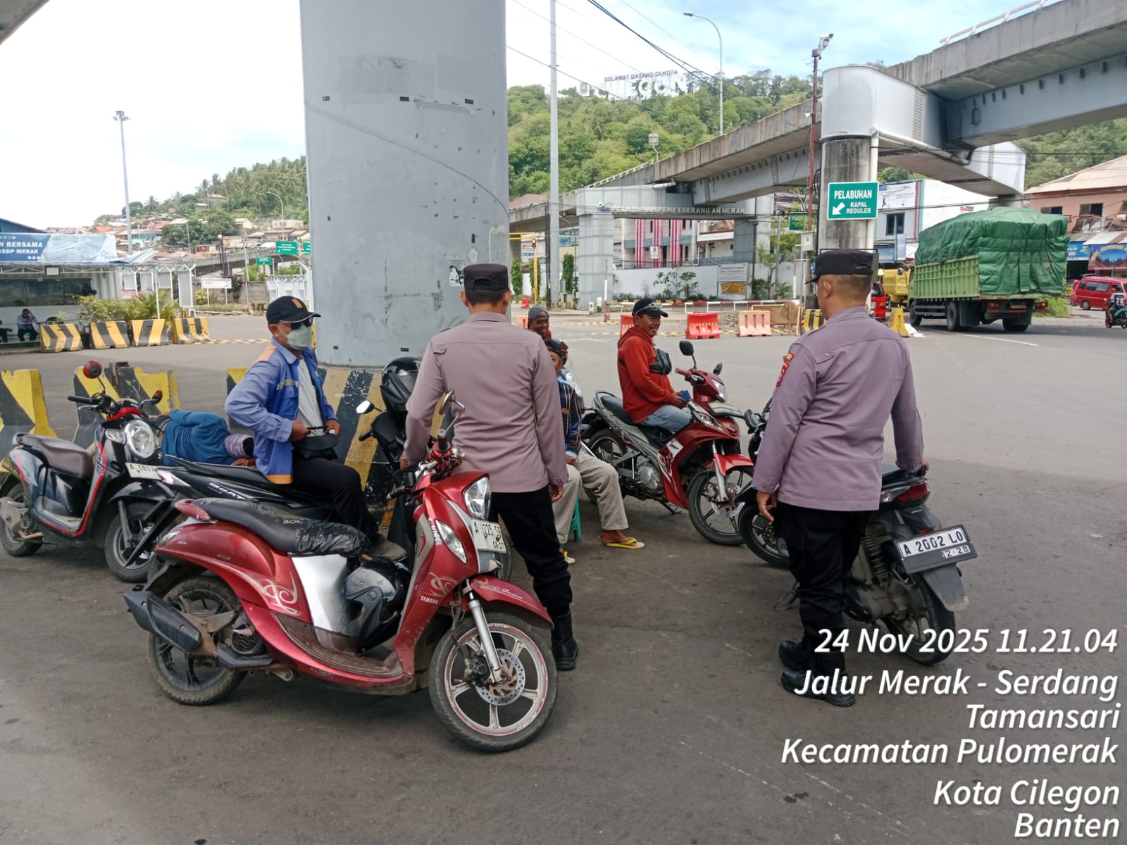 Cilegon - Personel Polsek Kskp Merak Polres Cilegon Polda Banten melaksanakan sambang dan patroli kawasan pelabuhan merak dalam rangka menjaga Harkamtibmas di Kawasan Pelabuhan Merak, Senin (24/11/2025).