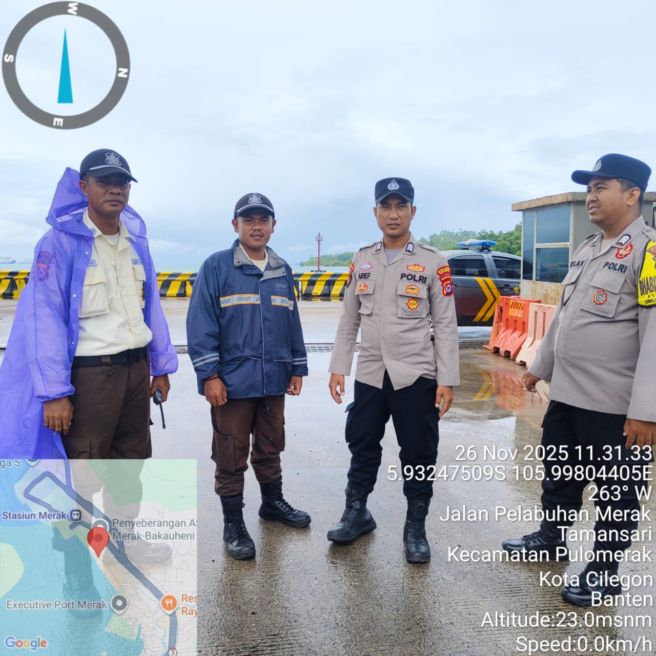 Cilegon - Personel Polsek Kskp Merak Polres Cilegon Polda Banten melaksanakan sambang dan patroli kawasan pelabuhan merak dalam rangka menjaga Harkamtibmas di Kawasan Pelabuhan Merak, Rabu (26/11/2025).