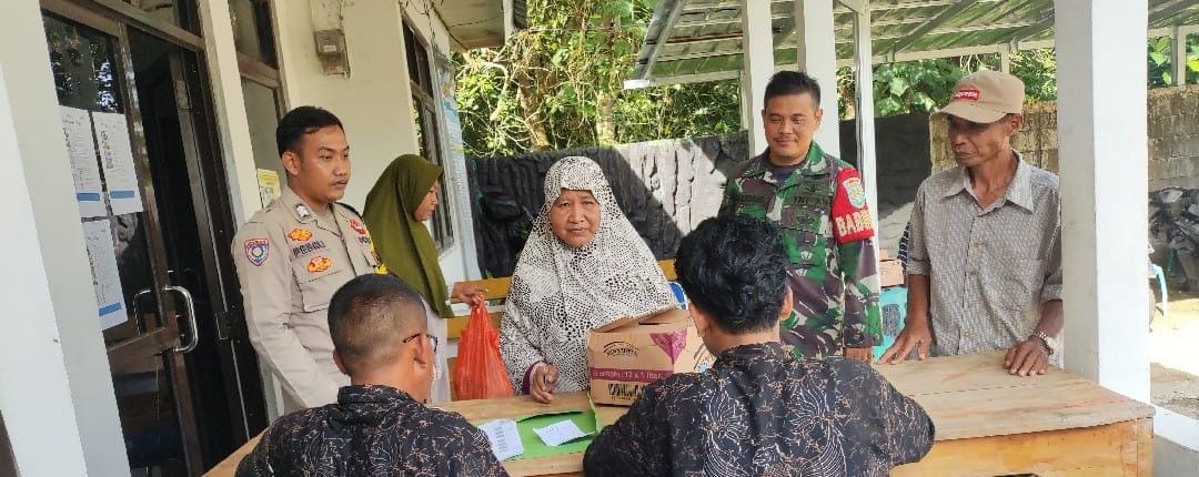 Cilegon - Bhabinkamtibmas Polsek Anyar Polres Cilegon Polda Banten  melaksanakan pengamanan Kegiatan Penyaluran bantuan Sembako dari Pemerintah tahun 2023 oleh Pos Indonesia Kec. Anyar, Kamis (27/11).