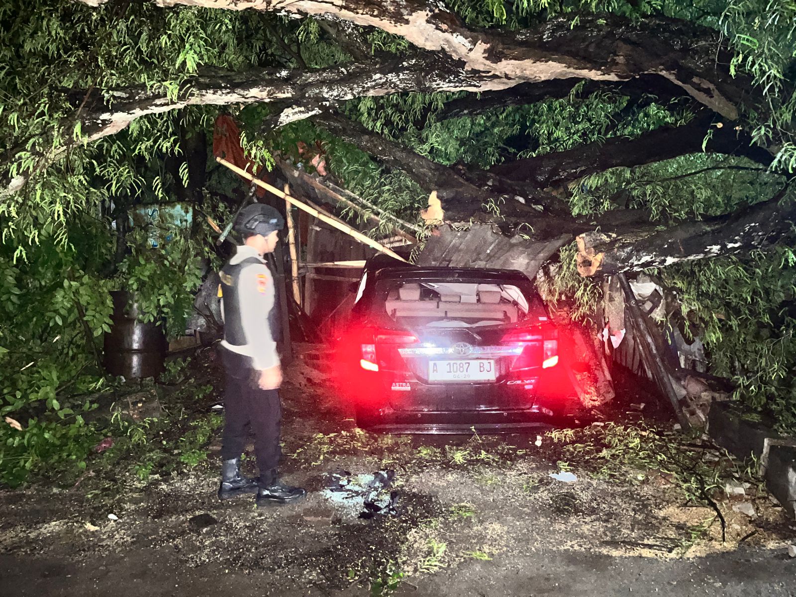 Cilegon - Pohon tumbang di Link Kubang Welut, Rt 02/04, Kel. Kubangsari, Kec. Ciwandan, Kota Cilegon, menimpa kendaraan R4 Toyota Caliya A 1087 BJ yang sedang terparkir, Selasa (16/12/2025).