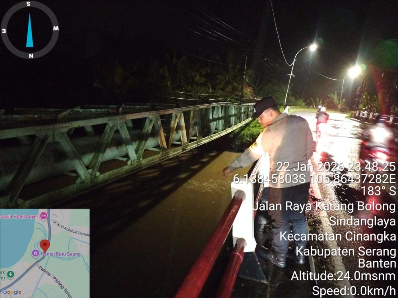 Piket Polsek Cinangka secara rutin melakukan pengecekan kondisi sungai dan berkoordinasi dengan pihak terkait untuk memantau perkembangan debit air. Pemantauan ini juga melibatkan partisipasi aktif dari masyarakat setempat.